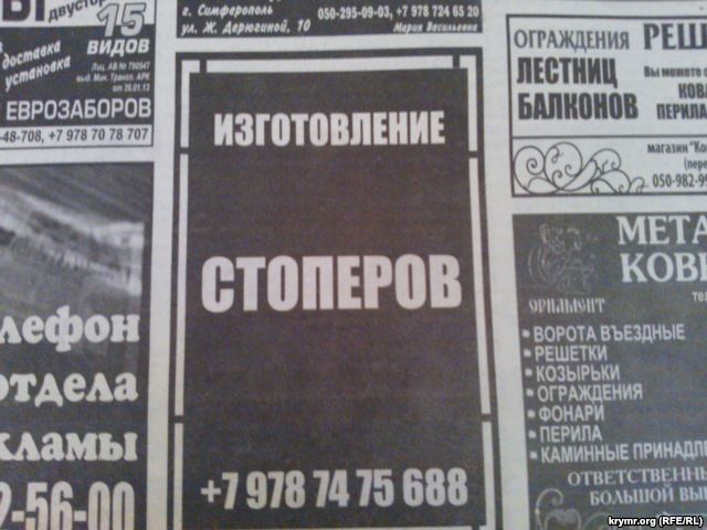 Рекламщики со страниц крымской газеты объявлений предлагают изготовление «стоПеров» и печать на «баНерах». Судя по номеру телефона, фирма одна и та же. Как и ошибка – в обоих словах не хватает по букве. Стопперы стали «стоперами», а баннеры – банерами.
