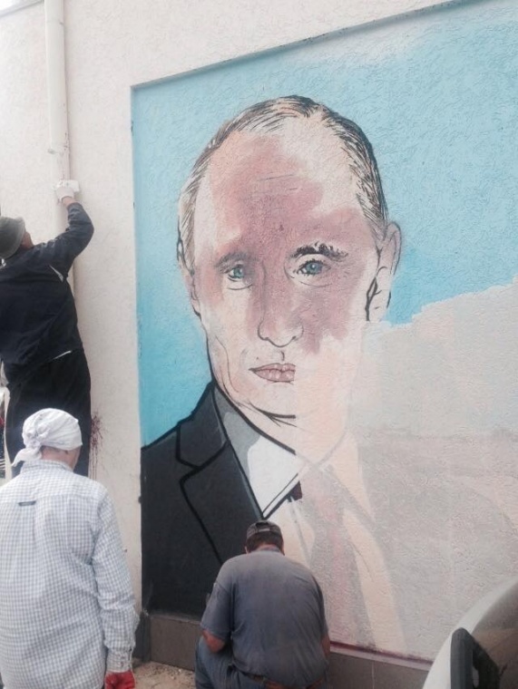 Сегодня работники коммунальных служб города закрасили один из первых портретов Владимира Путина, появившихся в Крыму. Как рассказал один из коммунальщиков, минувшей ночью хулиганы измазали лицо Путина краской, которая оказалась настолько едкой, что ее невозможно было отмыть. «У нас нет художников, поэтому мы получили задание просто закрасить рисунок», – отметил сотрудник службы. Он также отметил, что это не первый портрет, который был изуродован хулиганами, однако предыдущий рисунок на улице Куйбышева удалось отмыть.