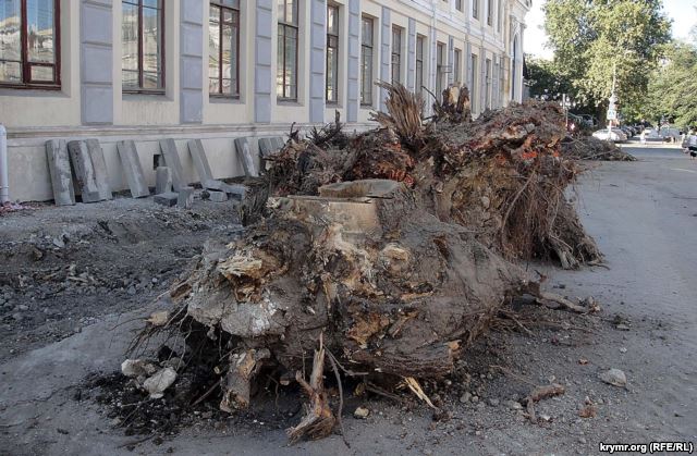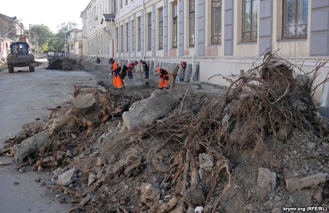 Сквер на углу улиц Горького и Жуковского в Симферополе окончательно очищен от деревьев. Также полностью уничтожены огромные акации и на отрезке улицы Жуковского до перекрестка с улицей Гоголя. Работы не прекращались даже в воскресный вечер, рабочие укладывали плитку. Заканчивается асфальтирование проезжей части улицы. По свежеуложенному асфальту видно, насколько уменьшился за счет уничтожения деревьев тротуар. Как сообщалось, в Крыму разрешили уничтожать деревья даже на особо охраняемых природных территориях. Согласно порядку, утвержденному правительством Крыма, удаление зеленых насаждений является правомерным в случаях осуществления строительства, реконструкции, капитального ремонта объектов капитального строительства на основании выданного разрешения на строительство, а также в случаях, при которых получение разрешения на строительство не требуется.