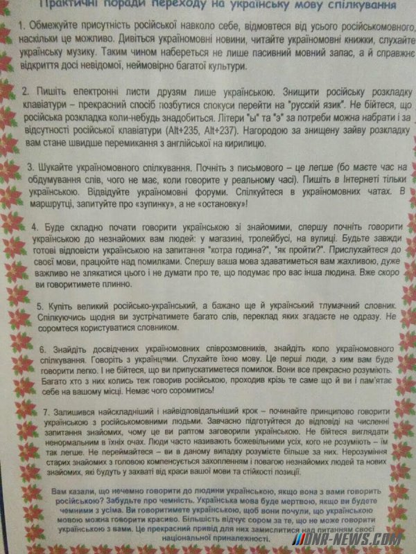 В Киевской гимназии считают, что разговаривать по-русски - это "искушение", а русскую раскладку клавиатуры нужно уничтожить.?? В гимназии №261 города Киева разместили памятку с советами по отказу от русского языка. Основной акцент сделан на том, чтобы забыть "русскiй язик". "Уничтожить русскую раскладку клавиатуры - прекрасный способ избавиться от искушения перейти на "русскiй язик" - написано в памятке. При этом указано сочетание клавиш для набора отдельных букв русского алфавита в украинской раскладке. Кроме того, памятка призывает принципиально говорить на украинском с русскоязычными людьми. "Забудьте про вежливость" - гласит памятка. "Вам говорили, что невежливо говорить с человеком на украинском, если он с вами говорит на русском? Забудьте про вежливость. Украинский язык будет мертвым, если вы будете вежливыми со всеми. ... Это прекрасный повод для них задуматься над вопросом своей национальной принадлежности" - указано на стенде в гимназии. Источник: dnr-news.com |