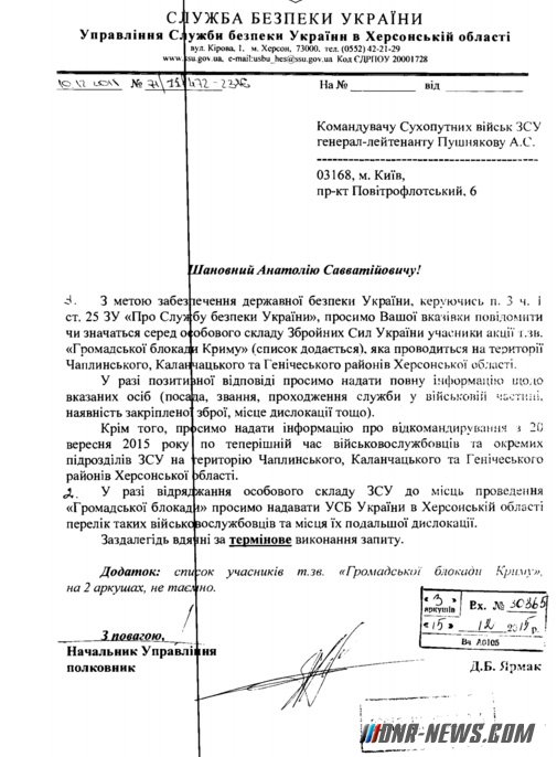 Служба безопасности Украины истребовала у руководства Сухопутных войск ВСУ личные данные военных, которые могут находиться среди участников "Гражданской блокады Крыма". Согласно запросу в адрес командующего СВ ВСУ, управление СБУ в Херсонской области просит сообщить, есть ли из указанных в списке 49 участников блокады представители личного состава ВСУ, и были ли откомандированы в места проведения блокады (Чаплинский, Каланчакский и Генический районы) военнослужащие и отдельные подразделения ВСУ в период с 20 сентября 2015 года. "В случае положительного ответа просим предоставить полную информацию относительно указанных лиц (должность, звание, прохождение военной службы, наличие закрепленного оружия, место дислокации)" – говорится в запросе. Источник: dnr-news.com |