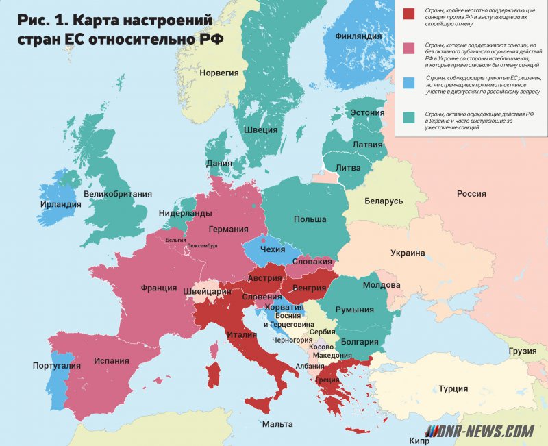 На украинском сайте zn.ua составили карту лояльности стран ЕС к России. В вопросе отношения к России и политики санкций против нее страны Евросоюза можно условно разделить на четыре группы: - те, кто неохотно выполняют санкции, - страны, которые поддерживают санкции, но с радостью бы их отменили, - те страны, которые поддерживают санкции, но не участвуют в обсуждении российской агрессии против Украины и - те, кто принимает активное участие в политике давления на Россию за антиукраинскую войну и требуют его усиления. Кроме того, на сайте, в итогах проекта "Похищение Европы" выложили список "пророссийских" организаций в странах ЕС: