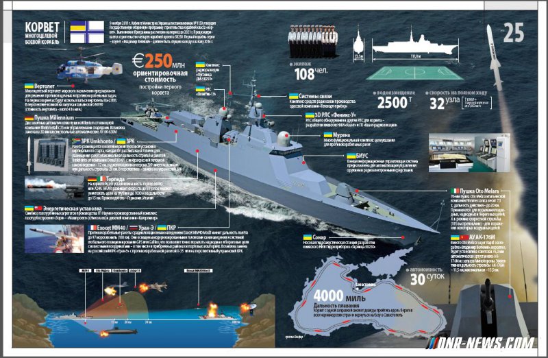 Основу восстановленных Военно-Морских Сил Украины должны составлять новые корветы проекта 58250. Об этом заявил Главнокомандующий ВМС Украины, вице-адмирал Сергей Гайдук. «Хочу особо отметить ключевую роль в возрождении боевого потенциала ВМСУ, которую должно сыграть завершение строительства головного корвета пр.58250 «Владимир Великий» - отметил Сергей Гайдук. Главнокомандующий ВМС Украины заявил, что пр.58250 – украинский перспективный боевой корабль, который по своим ТТХ не уступает зарубежным аналогам, но в данный момент, уже в течение двух лет, строительство фрегата остановлено. Как отметил Главнокомандующий ВМС Украины: «дальнейшее промедление с реализацией государственной программы по строительству корвета может привести к ряду негативных последствий, начиная от разрушения национальной системы кораблестроения, дискредитации страны, как надежного партнера перед иностранными поставщиками уникального оборудования, вплоть до потери боевого потенциала ВМС, следствием чего будет господство вражеского флота у наших берегов, добыча углеводородного сырья в нашей исключительной экономической зоне и другие вызовы национальным интересам Украины на море». Также С.Гайдук добавил, что «активизация работ по строительству нового корвета в 2016 г. позволит уже к концу 2018 г. получить готовый корабль и создать условия для быстрого и гарантированного восстановления боеспособности ВМС Украины» На данный момент техническая готовность корвета «Владимир Великий» составляет 32%. Однако, уже третий год, как строительство корвета остановлено из-за нехватки финансирования. Источник: dnr-news.com |
