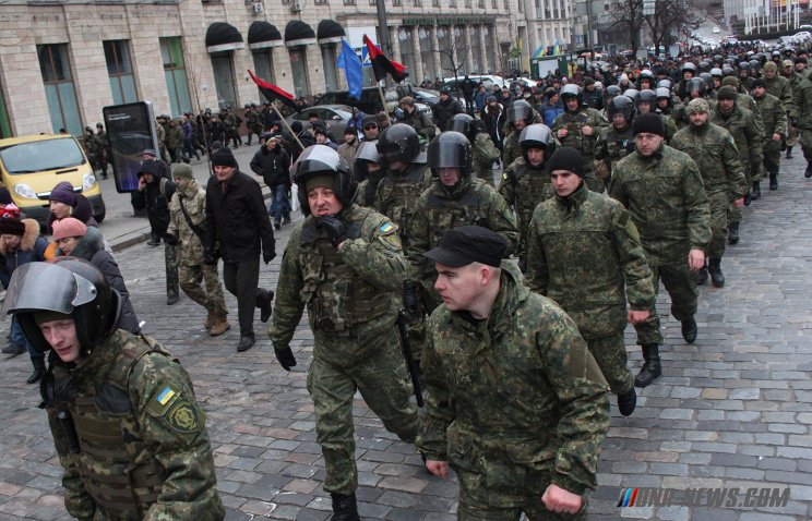 Около 40 человек, одетых в военную форму, призывают организовать бессрочную акцию протеста против властей Украины. Люди, называющие себя «штабом революционных правых сил», пришли сегодня организованной колонной на площадь независимости. Протестующие требуют отставки действующих властей, денонсации Минских соглашений по Донбассу и освобождения политзаключённых на Украине. «Мы отсюда не уйдём, пока не уйдёт эта преступная власть», — заявил один из представителей штаба. Источник: dnr-news.com |