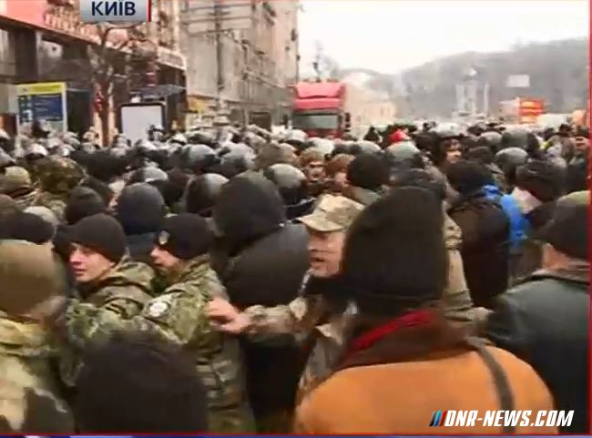 На Майдане Независимости произошло столкновение между протестующими и правоохранителями, пострадавших нет, сообщает телеканал "112 Украина". "Минут 10 назад к Дому профсоюзов подъехал грузовик, в котором, по предварительной информации, было оборудование для сцены. До этого возле Стеллы расчищали дорогу для сцены. Как только грузовик подъел, к нему подбежали около 100 человек от Стеллы. Но правоохранители заблокировали этот грузовик. Произошло столкновение. Пострадавших нет. Я заметил разбитую губу у одного из правоохранителей" - сообщил корреспондент телеканала. "Спустя минут десять грузовик сдал назад и поехал в сторону Европейской площади. Люди вернулись к Стелле, а правоохранители ушли" - добавил корреспондент. Источник: dnr-news.com |