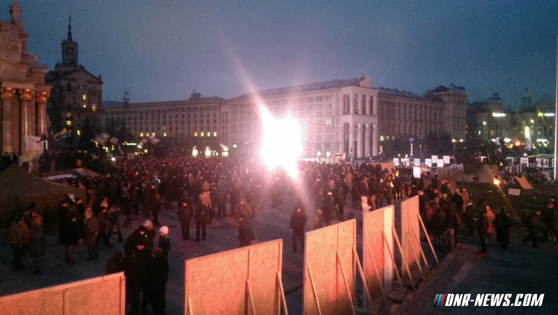 Украинские радикалы проводят так называемое "вече" на площади Независимости в центре Киева, где собралось порядка 300 человек, основная аудитория собрания - пенсионеры. На майдане Незалежности собралось порядка 300 человек, большая часть людей стоит рядом со стелой Независимости. Возле нее оборудована сцена, с которой звучат довольно радикальные высказывания в адрес украинской власти и Петра Порошенко в частности. Не известные широкой аудитории выступающие называют нынешние власти "предателями", обвиняют ее в сложившейся в стране ситуации, а также призывают власть уйти в отставку. Звучат лозунги "слава нации", "слава Украине" и другие. Большая часть митингующих - пенсионеры, также много мужчин средних лет. Молодых людей на нынешнем "майдане" немного. Собрание проходит без серьезных происшествий, однако произошла небольшая перепалка - с "майдана" прогнали мужчину, который попытался поспорить с протестующими. Конфликтов с правоохранителями пока зафиксировано не было. Участники митинга разбились на небольшие группки - они обсуждают политику и греются у костров, которые разожгли в бочках. Между протестующими ходят ряженый в костюме смерти с косой, на которой написано "Петя и Сеня". На площади установлены палатки, часть митингующих планирует протестовать всю ночь. Также в планах активистов передать свои требования властям. Источник: dnr-news.com |