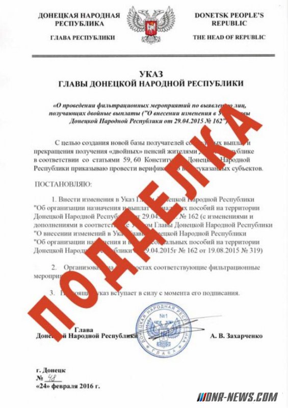 Как сообщает Администрация Главы ДНР, сегодня в украинских соцсетях и электронных масс-медиа начал активно распространяться очередной сфабрикованный «указ» Главы ДНР Александра Захарченко. В этом так называемом «документе» идет речь о якобы принятом руководством Республики решении организовать въезжающим в ДНР со стороны Украины «фильтрационные мероприятия». По утверждению авторов этого вброса, с помощью подобных пунктов власти ДНР собираются выявлять жителей Донбасса, получающих пенсии на территории государства Украина, с целью лишения их в дальнейшем пенсий и социальных выплат в Республике. В связи с появлением этой фальшивки, Администрация Главы ДНР информирует жителей Донецкой Народной Республики, что подобного указа не существует. Также информируем, что Глава ДНР не подписывает документы, противоречащие действующему законодательству Республики. Все нормативные акты, имеющие законную силу, и подписанные Главой ДНР, находятся в открытом доступе на официальном сайте Донецкой Народной Республики. Любые документы, опубликованные на иных ресурсах, являются сфабрикованными и не имеющими законной силы. Следует особо отметить, что Донецкая Народная Республика является социально ориентированным государством, в котором власти ответственно относятся к выполнению социальных обязательств перед своими гражданами. Источник: dnr-news.com |