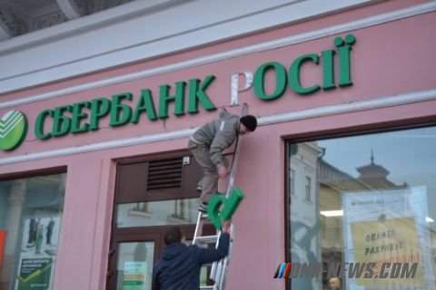 В Черновцах принудительно демонтировали часть вывески Сбербанка России