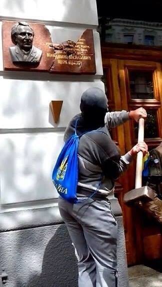 Украинский неандерталец уничтожил памятную доску Владимиру Щербицкому