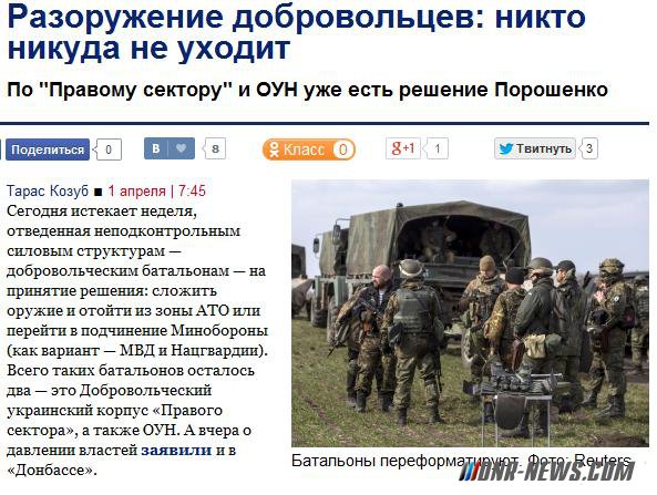 Сегодня истекает неделя, отведенная неподконтрольным силовым структурам — добровольческим батальонам — на принятие решения: сложить оружие и отойти из зоны АТО или перейти в подчинение Минобороны (как вариант — МВД и Нацгвардии). Всего таких батальонов осталось два — это Добровольческий украинский корпус «Правого сектора», а также ОУН. А вчера о давлении властей заявили и в «Донбассе». Бить тревогу начал начштаба батальона Анатолий Виногродский: «Донбасс» вышел из села Широкино под Мариуполем после четырех суток боев. «Штурмовой батальон, три месяца проходивший слаживание после Иловайска, получил приказ выйти из-под Широкино и вернуться в Киев, — написал в «Фейсбуке» парламентский комбат Семен Семенченко. — «Донбасс» является батальоном Нацгвардии еще с июня 2014-го, всегда выполнял приказы (выполнит и этот) — не понимаю, почему ребят отводят». В самом батальоне проводят параллель между «сложным» в управлении и максимально самостоятельным «Донбассом», «Азовом» «Святой Марией», входящими в ВСУ и Нацгвардию, и формально независимыми батальонами. «Что к ним, что к нам есть претензии. Плохо управляемые, можем сорвать какие-то подковерные договоренности нашей власти с Москвой», — передал анонимно один из бойцов. В батальоне ОУН нам подтвердили: место дислокации, село Пески под Донецком, покидать не намерены. Слагать оружие — тоже. «Отойдем — сдадим территорию сепаратистам. А вот штаб АТО действует, исходя из общей политики государства, — власти любят договариваться, — сказал «Вестям» представитель ОУН Богдан Тицкий. — Пока угроз со стороны штаба не было». Источник: dnr-news.com |