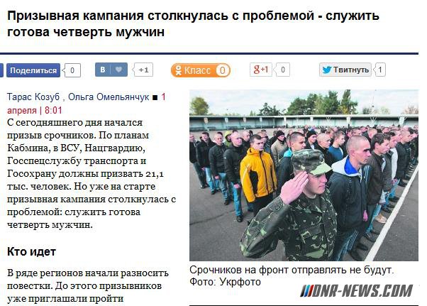 С сегодняшнего дня начался призыв срочников. По планам Кабмина, в ВСУ, Нацгвардию, Госспецслужбу транспорта и Госохрану должны призвать 21,1 тыс. человек. Но уже на старте призывная кампания столкнулась с проблемой: служить готова четверть мужчин. Кто идет В ряде регионов начали разносить повестки. До этого призывников уже приглашали пройти медкомиссию и для уточнения данных. «Что у нас, что у соседей — показатели одинаковы: около 25% призывников приходят сами, за остальными ходим. План по области — 1100 человек, а готовность небольшая, — сказал «Вестям» замвоенкома Кировоградской области Александр Робул. — Народ боится призыва, хоть мы и объясняем, что отправлять в АТО никого не будут, — не верят». Похожая ситуация — во Львовской области, один из военкомов рассказал о недостаче 70% призывников: «Всему виной — отмена призыва для ребят 18 и 19 лет, а именно они составляли 69–74% от общего количества срочников. Мало того, призывной возраст продлили с 25 до 27 лет, но в этом возрасте мужчин обычно списывают с учета — чтобы они служили, им нужно добровольно восстанавливаться. Как вы понимаете, желающих немного», — сказал военком. Зато в столице ситуация стабильна: замвоенкома Киева Игорь Слюсаренко рассказал, что призывают по плану (порядка 1,4 тыс. человек). «Уклонистов хватает, как и раньше, но есть и добровольцы, отчасти срочная служба нужна им для работы», — сказал «Вестям» Слюсаренко. Прошерстили общежития Но без перегибов не обошлось и в столице. Студенты КПИ выложили в Сеть видео, на котором сотрудники Соломенского военкомата совместно с милиционерами ранним утром шерстят общежитие университета на предмет уклонистов и студентов, восстановившихся на дневной форме обучения (соответственно, потерявших право на отсрочку). «Ворвались в комнаты, заставили расписаться в получении повесток. В случае несогласия угрожали доставить в военкомат в наручниках. Собрали 60 человек во дворе, держали на холоде, а потом в Соломенском военкомате заставили проходить медосмотр, также принудительно. Уйти мы не могли», — пожаловались студенты. Юристы говорят, что надевать наручники никто не имел права, но замкомиссара Соломенского военкомата Александр Майборода убежден: подобные меры необходимы. «Это студенты, которые подлежат призыву, но уклонялись. Военнослужащие вели себя корректно, с 7:30 утра температура на улице составляла более 8 градусов — не замерзнешь. Я лично дал понять ребятам, что в АТО никого из них забирать не будут, хоть их сверстники охотно идут на фронт. А эти проедают деньги мамы-папы, делая вид, что получают знания». Источник: dnr-news.com |