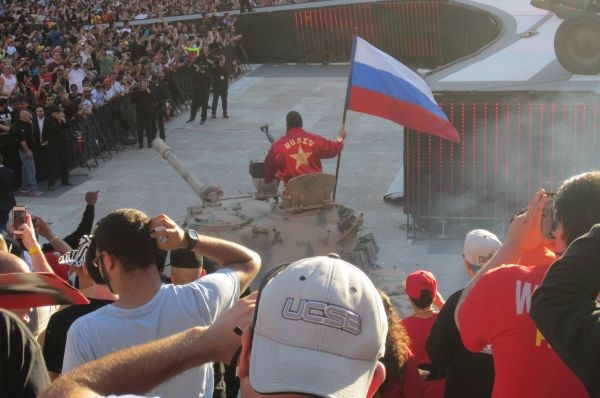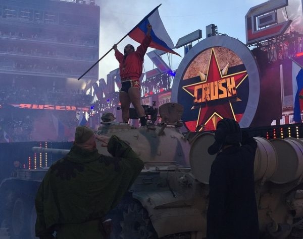 Давным-давно известно, что от страха перед русскими танками, наматывающими на траки хайвеи США американские генералы сходили с ума и выбрасывались из окон. И страшный сон стал явью - гимн России зазвучал в небе над США, флаг России гордо развивается в Калифорнии, а русские танки под гром наших орудий приводят в состояние истерии американцев. Мало кто ожидал, что самое сердце южной части США – солнечный штат Калифорния, окрасится в цвета российского триколора, но это свершилось (видео ниже)! Конечно, рестлеры славятся своей эпатажностью и эффектными появлениями на публике, но появление Русева вызвало настоящий фурор. Примечательно, что бой между почитателем России, который, кстати, является выходцем из Болгарии и другим бойцом - Джоном Синой, состоялся еще 29 марта, но заокеанские СМИ деликатно обошли красочную предысторию стороной, лишь скупо описав ход самого поединка. Там также решили не публиковать видео с ярким представлением в исполнении Русева.
