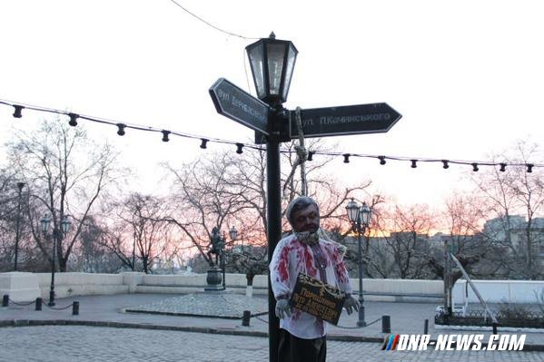 ![]() Об этом сообщают очевидцы в сети Интернет. Чучело было повешено на перекрёстке улиц Дерибасовской и Леха Качинского на указательном столбе возле памятника Иосифу де Рибасу.