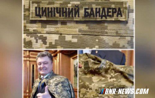 Придворные стилисты Порошенко отличились в очередной раз. После того как дуче «Правого сектора» Ярош грубо указал своему президенту, что тот явно перебрал с риторическим популизмом, когда назвал убийц офицера СБУ «циничными бандерами», гетману срочно потребовалось сохранить лицо и одновременно удержать рейтинг. Этим лицом у Порошенко служат его карнавальные костюмы, большей частью камуфлированные, куда его окружение (Аваков, Наливайченко, Стець, Ложкин, Ляшко – нужное подчеркнуть) старательно пришивают новые шевроны или нашивки. Помните, он выходил на публику с надписью «Укроп», теперь натовский камуфляж украшает надпись: «Циничный бандера». Как говорится, все свое ношу собой!