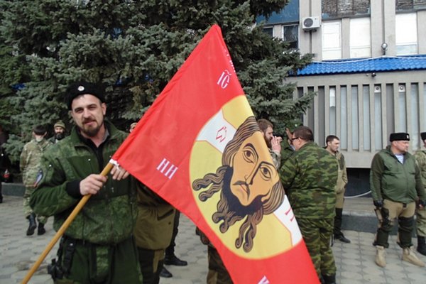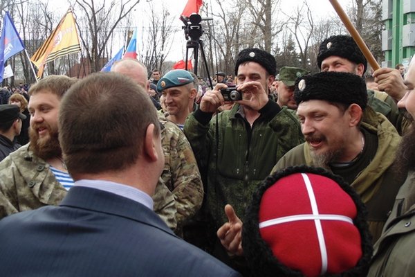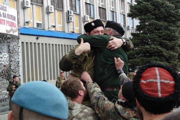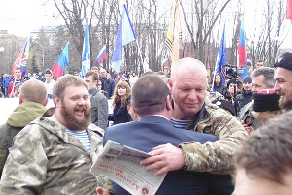 На торжественный митинг, посвящённый годовщине захвата здания СБУ, прибыла делегация казаков из Стаханова во главе с Павлом Дрёмовым. Как сообщает корреспондент ИА «Новороссия», после прибытия казаков глава ЛНР Игорь Плотницкий лично поприветствовал одного из самых ярких командиров Луганской Республики Павла Дрёмова и актив казачьего полка имени Платова. Они обменялись крепкими мужскими объятиями и довольно эмоционально поздравили друг друга с этой знаменательной датой. На митинге у здания бывшего управления СБУ собрались представители разных военных подразделений ЛНР, гражданские активисты и непосредственные участники акций протеста прошлого года. «Сегодняшняя дата объединила всех ради общей цели — победы над украинскими нацистами и возвращения в Россию», — заявил корреспонденту ИА «Новороссия» один из участников митинга. Не случайно перед сценой был развернут десятиметровый российский флаг.