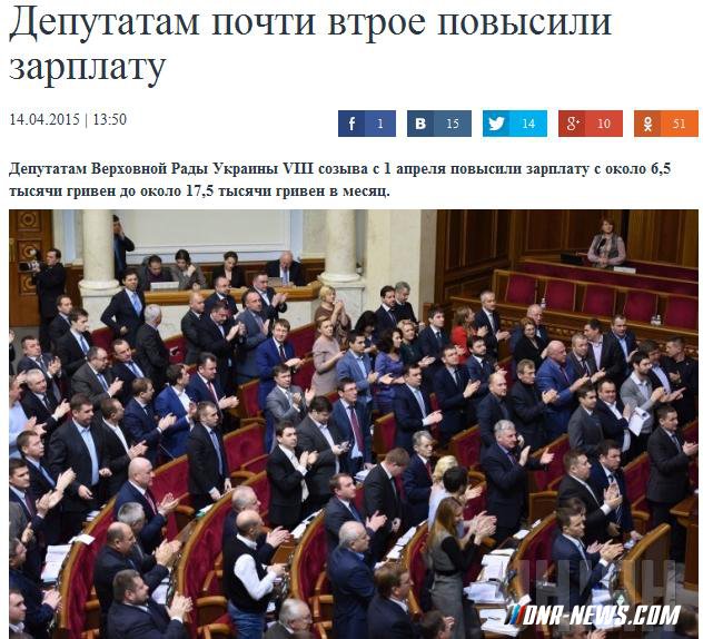Депутатам Верховной Рады Украины VIII созыва с 1 апреля повысили зарплату с около 6,5 тысячи гривен до около 17,5 тысячи гривен в месяц. Об этом на своей странице в сети Facebook написал народный депутат Верховной Рады VII созыва, член политсовета "Батькивщины" Андрей Павловский. "Хорошая новость для Мустафы (народный депутат Украины Мустафа Найем)... Повысили! С 1 апреля повысили не только тарифы для населения, но и зарплату для чиновников и депутатов до 17,5 тысячи гривен", - отметил он. Как сообщалось ранее, 13 марта Президент Украины Петр Порошенко отменил ограничения максимального месячного размера заработной платы народных депутатов Украины, членов Кабинета министров Украины, прокуроров, работников государственных органов, работников Национального банка Украины, судейской власти. Источник: dnr-news.com |