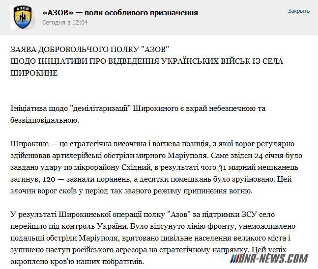 Инициатива "демилитаризации" поселка Широкино в Донецкой области является крайне опасной, поскольку этот населенный пункт является стратегической точкой в обороне Мариуполя. Об этом заявляет полк "Азов" на своей странице в социальной сети "ВКонтакте". "Широкино - это стратегическая возвышенность и огневая позиция, с которой враг регулярно осуществлял артиллерийские обстрелы мирного Мариуполя. Отсюда 24 января был нанесен удар по микрорайону Восточный, в результате чего 31 мирный житель погиб, 120 - получили ранения, а десятки помещений были разрушены. Это преступление враг совершил в период так называемого режима прекращения огня", - говорится в сообщении. В то же время, в полку напомнили, что в результате Широкинской операции полка "Азов" и Вооруженных сил Украины село перешло под контроль Украины. "Была отодвинута линия фронта, исключены дальнейшие обстрелы Мариуполя, спасено гражданское население большого города и остановлено наступление русского агрессора на стратегическом направлении. Этот успех окроплен кровью наших братьев", - говорится в заявлении. Кроме того представители полка выразили мнение, что отвод украинских войск и организация пункта по мониторингу прекращения огня в Широкине означает потерю этой украинской территории даже при условии присутствия там миссии ОБСЕ. "А отдать Широкино - это добровольно открыть ворота в Мариуполь. Под угрозой окажется почти полмиллиона его жителей. Государство рискует потерять важные стратегические объекты промышленности, расположенные в городе", - предупреждают в полку. - Мы, бойцы полка "Азов", призываем главнокомандующего и высшее руководство государства не допустить роковой ошибки и не бросать Широкино и Мариуполь на произвол судьбы. Уверены - это направление нуждается в усилении обороны, а не отвод войск".