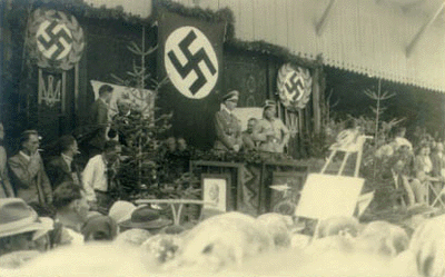 «Свастика и портрет Гитлера на трибуне»
