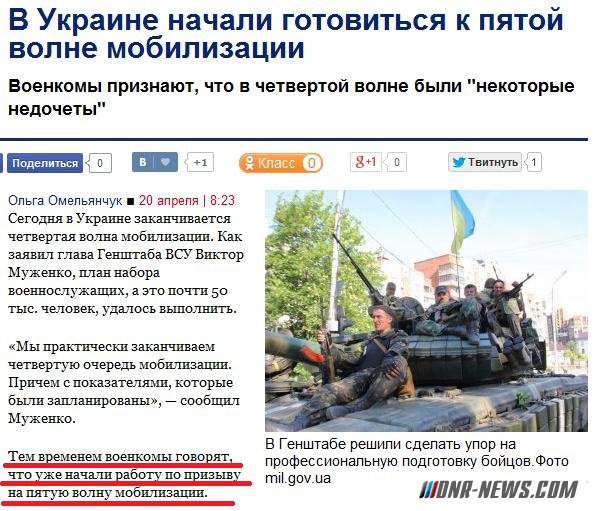 Сегодня в Украине заканчивается четвертая волна мобилизации. Как заявил глава Генштаба ВСУ Виктор Муженко, план набора военнослужащих, а это почти 50 тыс. человек, удалось выполнить. «Мы практически заканчиваем четвертую очередь мобилизации. Причем с показателями, которые были запланированы», — сообщил Муженко. Тем временем военкомы говорят, что уже начали работу по призыву на пятую волну мобилизации. «Сейчас идет изучение мобилизационного ресурса. Мы уже начали вручать повестки на прохождение медкомиссии и уточнение персональных данных. Официальный призыв начнется, как только нам передадут соответствующее распоряжение из Генштаба», — рассказал нам замглавы военкомата Киева Игорь Слюсаренко. По словам замвоенкома Киева Игоря Слюсаренко, четвертая волна мобилизации в столице прошла успешно, но хоть план и выполнен, есть некоторые недочеты. «Киев справился с поставленными задачами по мобилизации, но были некоторые специальности, которые требовались, но у нас их не было. К примеру, авианаводчики. Это дефицитная специальность, у нас их по Киеву всего несколько человек. Поэтому нам помогли, есть взаимозаменяемость», — прокомментировал Слюсаренко, подчеркнув, что одними из самых востребованных специальностей в ходе четвертой волны были водители и экипажи боевых машин — командир машины, механик и наводчик. Тем временем в Генштабе говорят, что в ходе четвертого этапа мобилизации были изменены некоторые подходы к комплектованию воинских частей, мол, теперь берут не количеством, а качеством. «Мы сделали упор на профессиональную подготовку тех, кто попадает в войско. Во время четвертой очереди срок подготовки военных специалистов составлял полтора месяца и более. Это позволило нам готовить бойцов более качественно как в профессиональном плане, так и в психологическом», — рассказал Муженко. Глава Генштаба ВСУ также отметил, что подготовка мобилизованных проходит на базе укомплектованных на 80% (техника, вооружение и т. д.) учебных подразделений/полигонов. «Во время обучения появляются определенные проблемы, связанные с интенсивностью использования материальной базы. Например, быстрое исчерпание моторесурса. Это все рабочие моменты, к которым мы готовы», — подытожил Муженко. Правда, положительная информация о результатах четвертой волны мобилизации далеко не у всех. Военкомы Львова и области на правах анонимности сообщили «Вестям», что выполнить план им еле удалось. «Добровольцы идут как и раньше. Но все держится на патриотах. Многие из тех, кто подлежит мобилизации, не хотят отдавать долг государству и бегают. Такими занимаются правоохранители и военная прокуратура», — говорят военкомы. Источник: dnr-news.com |