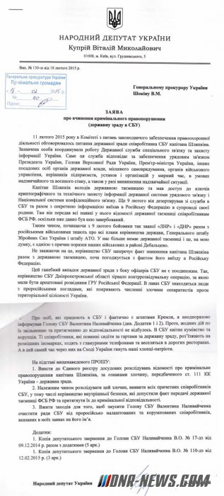 Депутат от Блока Петра Порошенко заявлял: начиная с 9 февраля, ополченцы ЛНР и ДНР знали обо всех планах Генерального штаба и штаба АТО. Это, по мнению властей Киева, устроил именно капитан Шляпкин. Сам офицер утверждает, что силовики обвиняют его в сотрудничестве с российскими спецслужбами только потому, что он после 15 лет службы в СБУ отказался воевать в Донбассе против своих соотечественников. После очередного офицерского собрания Шляпкину намекнули, что в лучшем случае его ждет увольнение.