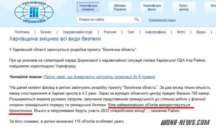 В Харьковской области заканчивается разработка проекта "Безопасная область". Об этом рассказал на селекторном совещании Госкомиссии по чрезвычайным ситуациям председатель Харьковской ОГА Игорь Райнин, сообщает Укринформ. "На данный момент специалисты в регионе заканчивают разработку проекта" Безопасная область ". За два месяца только количество камер наблюдения в Харькове выросла в 4,5 раза. Сейчас на улицах областного центра работает около 700 камер. Расширяется сеть подвижных патрулей, привлечение представителей общественности к совместной работы с физической охраны общественного порядка и общественной безопасности. У важнейших объектов используется бронетехника. Всего в патрулировании участвуют 2033 сотрудники милиции ", - отметил Райнин. По его словам, в регионе определены 115 объектов особого внимания. "Речь идет об объектах транспортной и энергетической инфраструктуры, связи и коммуникаций. Усиливается контроль и за тем, что происходит на дорогах области", - добавил Райнин. По его словам, до 1 мая на развилке автотрассы Белгород-Харьков-Киев-Ростов достроят комплексную оборонительное сооружение "Форт Солнечный". "Я приглашаю представителей Кабмина посетить этот объект", - сказал Райнин. Источник: dnr-news.com |