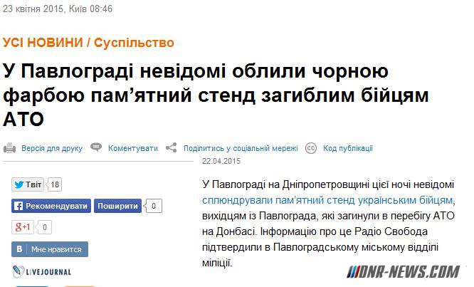 В Павлограде Днепропетровской обл. прошлой ночью неизвестные осквернили памятный стенд укрокарателям – выходцам из Павлограда, которые погибли в ходе АТО на Донбассе. Об этом сообщается со ссылкой на городской отдел милиции. По данным правоохранительных органов, стенд, установленный у здания горсовета, на котором были прикреплены фотографии 7 убитых карателей, был облит черной краской. Как отметила пресс-секретарь городского отдела милиции Анна Малышева, материал об инциденте зарегистрирован в милиции. "Весь личный состав Павлоградского горотдела милиции нацелен на установление и поиск правонарушителей", - сказала она. Также Малышева сообщила, что для установления нарушителей правоохранители обрабатывают информацию с камер видеонаблюдения, установленных в центре города. Источник: dnr-news.com |