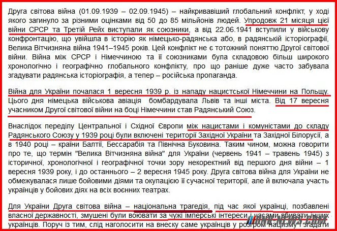 Полностью на портале "Образование". На Украину напали одновременно нацистская Германия и коммунистичсекий Советский Союз. Для Украины Вторая мировая война - национальная трагедия, когда украинцы, лишенные своего госудасртва, вынуждены были воевать за чужие интересы и украинцы убивали украинцев (это сейчас - в своем родном государстве украинцы убивают антиукраинцев за СВОИ интересы), но украинцы внесли решающую роль в разгром нацизма, а чем не следует забывать, несмотря на враждебную российскую пропаганду. via http://varjag-2007.livejournal.com/ Источник: dnr-news.com |