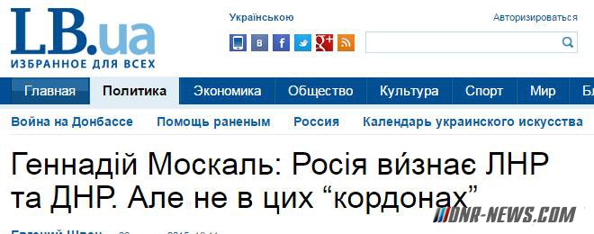 Кремль готов признать ДНР и ЛНР после расширения их границ. Об этом в интервью изданию LB.ua заявил назначенный Киевом глава Луганской областной военно-гражданской администрации Геннадий Москаль. «Офицеры Генштаба РФ из Ростова не уехали. Значит, они до сих пор там, и планируют уже новые операции. По той информации, которая у меня есть, Россия признает ЛНР и ДНР», — заявил Москаль. Однако по мнению губернатора Луганской области, перед этим ДНР и ЛНР еще расширят свои территории. «Не в этих границах. У них есть планы оттяпать у нас еще кусок Донецкой и Луганской областей. Вот после этого они их и признают», — заявил генерал. Он уверяет, что это проверенная информация. «Я работал заместителем главы СБУ и курировал контрразведку. Я в состоянии различить ложь и правду», — похвалился чиновник. В качестве же наиболее вероятных направлений наступления со стороны непризнанных республик Геннадий Москаль называет Мариуполь и Артемовск. «По моей информации, им нужен выход к морю через Мариуполь. А севернее им нужны Артемовск и Попасная. Это же все один плацдарм. Берут Артемовск — лишают Украину соли. А Попасная — это последний большой железнодорожный узел на Луганщине, который остается под Украиной. От последнего дома в Попасной до ближайшей позиции боевиков где-то 4 километра». Кроме того, Геннадий Москаль считает, что особо полагаться на усиление украинской армии в результате мобилизации не стоит. «Я вам так отвечу: я на малой родине живу в селе. Там кроме стариков и детей никого не осталось. И где, думаете, все? На заработках в России. У «агрессора». Так же мне нравится Тернопольская область, которая не способна эти планы по мобилизации выполнить. Зато сколько криков было: «Украина — понад усе», «Слава нации — смерть москалям». Что хотите было — митинги, флаги, а когда пришло время защищать Родину — все по россиям сидят», — откровенничает губернатор.