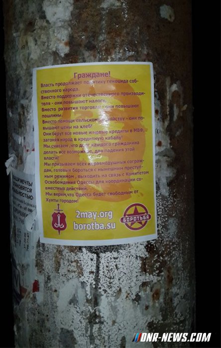 Депутат Одесского областного совета Алексей Албу сообщает о том, что на улицах Одессы появляются листовки с призывами к свержению Порошенко. В листовках акцентируется внимание на том, что власти повышают налоги и пошлины, вешают на плечи рядовых украинцев неподъёмные кредиты от МВФ, поощряют геноцид украинского народа. Портал «ПолитНавигатор» публикует текст одной из листовок, носящей название «Обращение к народам Причерноморья». Листовка призывает граждан, живущих в причерноморском регионе к сопротивлению против режима украинских властей. В 1941 году на нашу землю пришла беда. Пришли немецкие фашисты и их холуи — румынские захватчики. Они принесли нам горе и смерть. Города покрылись виселицами, в пригородах появились концентрационные лагеря, овраги и рвы наполнились телами расстрелянных людей. Враги зверствовали, но народ не смирился. Партизаны каждый день уничтожали фашистскую нечисть, а потом наступила весна 1944 года. Земли Причерноморья были освобождены доблестной Красной Армией. Враг был уничтожен, а чудом спасшиеся убийцы трусливо бежали в своё логово. Это не первые листовки подобного содержания. Ранее листовки и граффити о необходимости сопротивляться режиму Порошенко и его ставленников появлялись в Запорожье, Харькове и других городах Украины. СБУ, по сообщениям руководства службы, занимается поисками тех, кто развешивает «антиукраинские лозунги» на улицах Одессы. Источник: dnr-news.com |