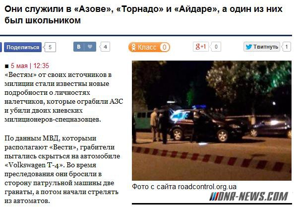 «Вестям» от своих источников в милиции стали известны новые подробности о личностях налетчиков, которые ограбили АЗС и убили двоих киевских милиционеров-спецназовцев. По данным МВД, которыми располагают «Вести», грабители пытались скрыться на автомобиле «Volkswagen Т-4». Во время преследования они бросили в сторону патрульной машины две гранаты, а потом начали стрелять из автоматов. Во время перестрелки с правоохранителями был смертельно ранен один из налетчиков - 23-летний харьковчанин Вадим Пинус. Его подельники оставили умирать в машине, а сами попытались скрыться. В автомобили правоохранители нашли целый арсенал оружия, а также нашивки с надписью «Спецподразделение «Торнадо» и «Правый сектор». Позже правоохранителям удалось задержать и остальных преступников. Как стало известно «Вестям», милиция взяла под стражу 20-летнего винничанина Евгения Кошелюка и 17-летнего жителя Винницы Романюка Андрея. Оба, по данным МВД, проходили службу в батальонах «Азов», «Торнадо» и «Айдар». Кроме того, в числе налетчиков был 17-летний киевский школьник Николай Монишенко. Он также задержан. По информации, которую можно встретить в интернете о Вадиме Пинусе, он служил в «Азове». Кроме того, в "Фольсквагене" милиционеры обнаружили два автомата 1979 и 1983 годов выпуска, четыре магазина с 50 патронами 5,45 мм, две гранаты, балаклавы с прорезью для глаз. В мусорном баке возле соседнего дома были найдены кобура и куртка со следами бурого цвета. Как ранее сообщали «Вести» всем задержанным грозит наказание вплоть до пожизненного лишения свободы. via vesti-ukr.com Источник: dnr-news.com |