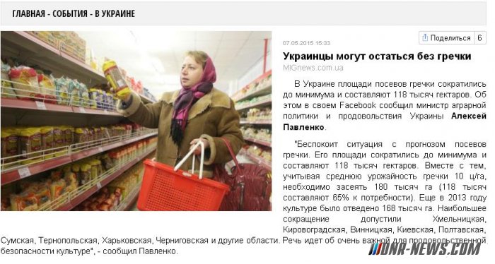 На Украине площади посевов гречки сократились до минимума и составляют 118 тысяч гектаров. Об этом в своем Facebook сообщил министр аграрной политики и продовольствия Украины Алексей Павленко. "Беспокоит ситуация с прогнозом посевов гречки. Его площади сократились до минимума и составляют 118 тысяч гектаров. Вместе с тем, учитывая среднюю урожайность гречки 10 ц/га, необходимо засеять 180 тысяч га (118 тысяч составляют 65% к потребности). Еще в 2013 году культуре было отведено 168 тысяч га. Наибольшее сокращение допустили Хмельницкая, Кировоградская, Винницкая, Киевская, Полтавская, Сумская, Тернопольская, Харьковская, Черниговская и другие области. Речь идет об очень важной для продовольственной безопасности культуре", - сообщил Павленко. Министр отметил, что такое сокращение площади посевов не является критическим, но необходимо увеличить ее на 50 тыс. га. "Главам администраций поручено отработать этот вопрос совместно с аграриями", - отметил глава ведомства. Источник: dnr-news.com |