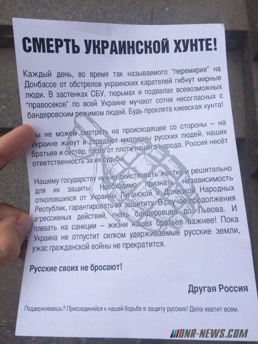 Россия должна смириться с неизбежностью санкций и осуществить изгнание бандеровцев с Украины «до Львова». Соответствующие листовки распространяет в Москве движение «Другая Россия» писателя Эдуарда Лимонова. В призыве говорится, что ежедневно во время «перемирия» на Донбассе от обстрелов украинских войск гибнут мирные люди, а в застенках СБУ и подвалах «Правого сектора» мучают сотни несогласных с бандеровским режимом. «Мы не можем смотреть на происходящее со стороны – на Украине живут и страдают миллионы русских людей, наших братьев и сестер, плоть от плоти нашего народа. Россия несет ответственность за их судьбы. Нашему государству нужно действовать жестко и решительно для их защиты. И плевать на санкции – жизнь наших братьев важнее!», — гласит призыв «лимоновцев». Источник: dnr-news.com |