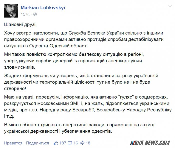 СБУ активно противодействует попыткам дестабилизировать ситуацию в Одессе и Одесской области. Об этом в Facebook написал советник главы СБУ Маркиян Лубкивский. ”Мы полностью контролируем безопасную ситуацию в регионе, пресекая попытки диверсий и провокаций и обезвреживая преступников. Никаких формирований или образований, которые бы составляли угрозу украинской государственности или территориальной целостности здесь не было и не будет создано” - подчеркнул советник. ”Имею в виду, прежде всего, информацию, которая ”гуляет” в соцсетях о так называемом ”Народном совете Бессарабии”, ”Бессарабской Народной Республике” и т.д. В городе и области продолжаются оперативные мероприятия, направленные на защиту украинской государственности и обеспечение безопасности одесситов” - пояснил Лубкивский. Источник: dnr-news.com |