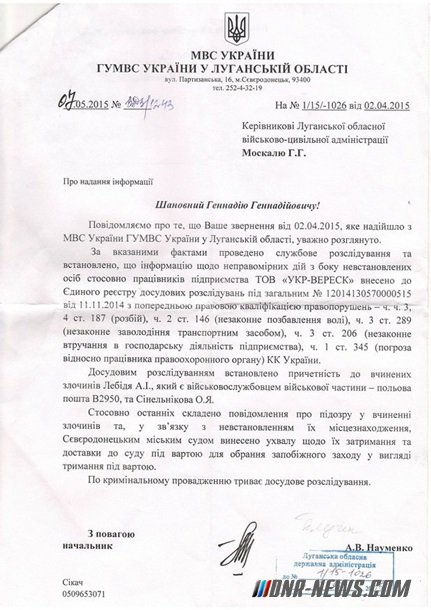 ![]() Об этом свидетельствует ответ начальника МВД в Луганской области Анатолия Науменко на запрос главы ОГА Геннадия Москаля. Документ Москаль обнародовал на своем сайте. Также Москаль заявил, что захват хлебзавода повлек дефицит хлеба, его резкое подорожание и социальное напряжение в Станично-Луганском и соседних районах региона. По его словам, бойцов "Айдара" удалось выгнать с хлебзавода только после требований областных властей обеспечить нормальную работу предприятия. Однако за время пребывания объекта под их контролем предприятию был нанесен ущерб в размере 2,4 млн грн.