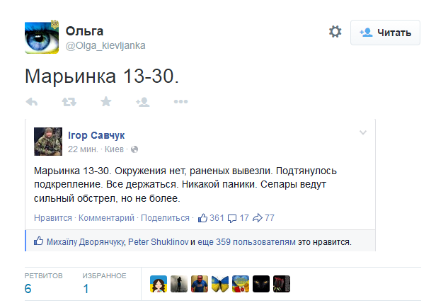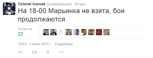 По состоянию на 18:00 военный обозреватель Борис Рожин (Colonel Cassad) сообщил, что Марьинка еще не перешла под полный контроль ополчения.