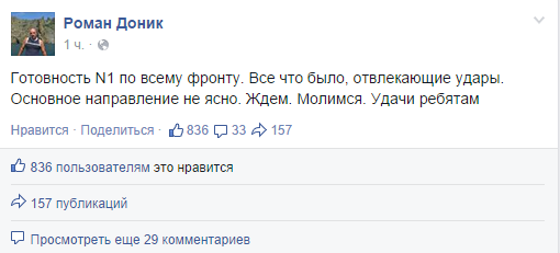 Украинцы паникуют и выдвигают новые версии происходящего. Так, украинский волонтер Роман Доник на своей странице в Facobook сообщил, что в зоне «АТО» объявлена повышенная готовность по всей линии фронта. «Готовность N1 по всему фронту. Все что было, отвлекающие удары. Основное направление не ясно», - написал он.