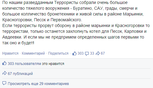 Также Никогосян сообщает, что каратели предполагают, что ополчение хочет взять Марьинку в кольцо. В подкрепление украинским силовикам отправили танки и БТРы. В Марьинке располагается 28-я бригада ВСУ.