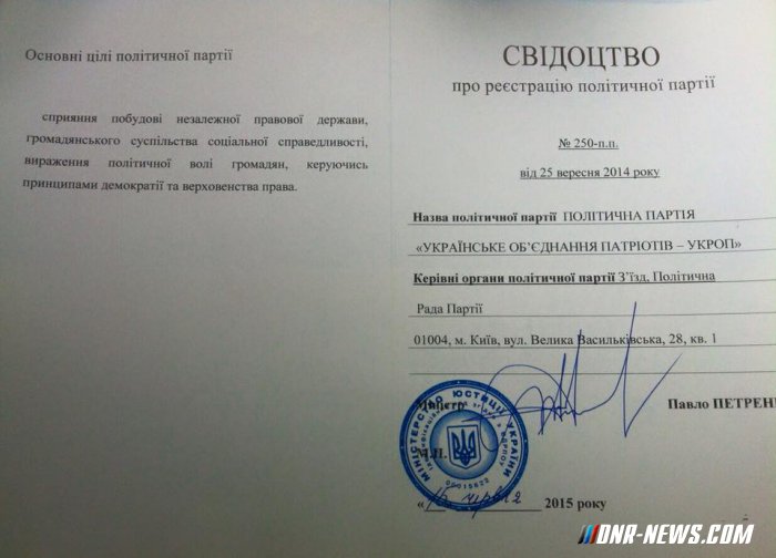 Министерство юстиции Украины официально зарегистрировало политическую партию «Укроп», созданную людьми из окружения украинского олигарха Игоря Коломойского. Об этом заявил в четверг бывший замглавы Днепропетровской ОГА Геннадий Корбан.