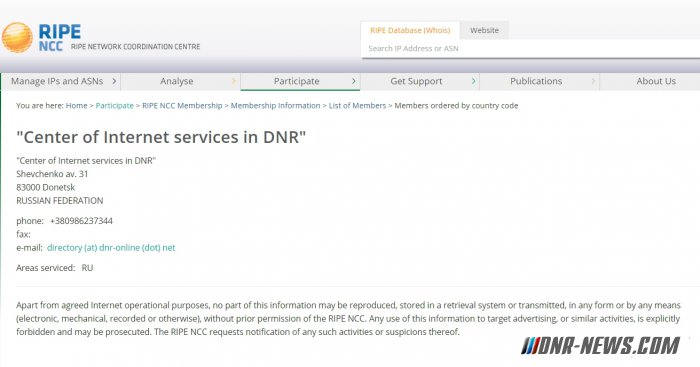 Список членов Европейского регионального интернет-реестра пополнился «Центром интернет-сервисов ДНР». Адрес центра был указан как «Донецк, Российская Федерация». Таким образом, Европейский региональный интернет-реестр не только признал существование Донецкой народной республики, но и указал, что она находится в России. Европейский региональный интернет-реестр (RIPE) — это организация, которая дает провайдерам разных стран возможность получать и регистрировать IP-адреса для работы сети. Источник: dnr-news.com |