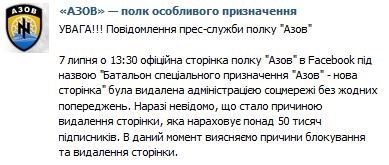 Администрация социальной сети Facebook удалила страницу полка "Азов". Об этом сообщила пресс-служба "Азова" ВКонтакте. "7 июля в 13:30 официальная страница полка "Азов" в Facebook под названием "Батальон специального назначения "Азов"- новая страница" была удалена администрацией соцсети без предупреждений" - говорится в заявлении.