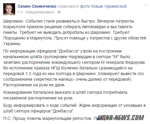 Бойцам "Донбасса" зачитали распоряжение командующего сектором "М" о выводе из Широкино. Об этом на своей странице в Facebook сообщил Семен Семенченко. "По информации офицеров "Донбасса", утром на построении начальником штаба группировки Нацгвардии было зачитано распоряжение командующего сектором "М" генерала Федорова. Во исполнение приказа Муженко, батальон, сражающийся на передовой 1,5 года, из них полгода в Широкино, планируют вывести (по соображениям секретности напишу - очень далеко от передовой). Распоряжение на руки не дали" - написал он. По его словам, вечером 25 июля проукраинские активисты Мариуполя начали подготовку к митингу против вывода войск из Широкино. "Требуют Порошенко в Мариуполь. Просят помощи у патриотов с других областей Украины" - добавил он. Ранее бойцы батальона заявляли, что не собираются покидать Широкино. Источник: dnr-news.com |