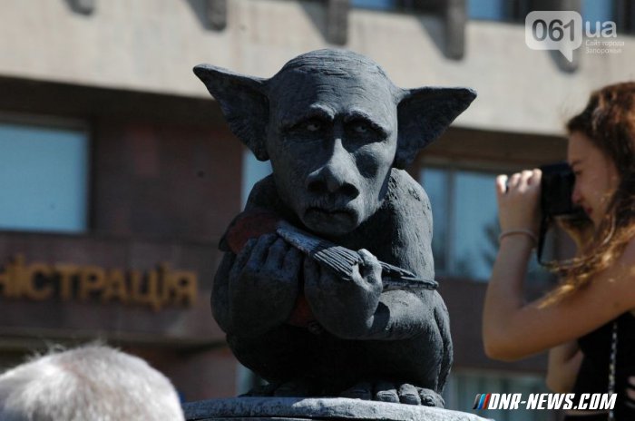Сегодня, 24 августа, в Запорожье на площади Героев у стен ОГА торжественно открыли памятник русскоязычному снегирю. Идея создания такого памятника пришла в голову запорожцу Максиму Дрозденко. С помощью скульптора он и воплотил ее в жизнь. "Это памятник единственному интернет-мему, который родился в Запорожье, мему о русскоязычных жидобандеровцах и снегирях. Этот памятник смволизирует одновременно умученного русскоязычного снегиря и русский мир, который скорбит над ним. Мы планировали его установить на базе отдыха "Сич" на Хортице, но с учетом того, что он здесь как родной, попробуем договориться с властью оставить памятник на площади Героев. Надеюсь, эта скульптура станет главной городской достопримечательностью", – говорит Максим Дрозденко. Как рассказал скульптор Александр Третьяк, выполнивший работу, создание памятника длилось несколько месяцев. "Он сделан из шамотной глины, размер около 50 на 50 см, а весит около 15 кг. Мы неоднократно его переделывали, искали, как сделать эффектнее. Перекрашивали, думали, как лучше показать задумку", – сказал Александр Третьяк. Уже сейчас возле скульптуры выстроилась очередь запорожцев, желающих с ним сфотографироваться. За лучший кадр Дрозденко обещает подарить мобильный телефон.