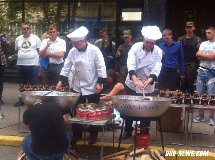 В центре Киева возле Генпрокуратуры Украины прошла акция, участники которой установили 2 больших котла с какао, где варят шоколадные фигурки украинских военных. На котлах — надписи: «Иловайский» и «Прокурорский». Собравшиеся обвиняют главного военного прокурора Анатолия Матиоса в том, что гибель украинской группировки в августе 2014 года в окружении до сих пор не расследована, а генералы не понесли наказание.