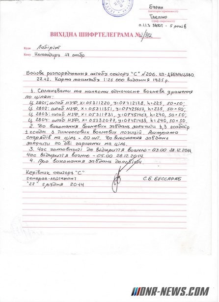 Однако, в начале сентября 2015 года нам наконец-то удалось получить снимки нескольких оперативных карт, по которым «работали» артиллеристы Вооруженных Сил Украины зимой 2014 – 2015 годов. Среди полученных карт, учитывая совпадение всех заданных параметров из исходного документа – мы можем с уверенностью 99,9% констатировать тот факт, что в приведенном ниже документе Украинские артиллеристы использовали лист карты (М-37-136,137 L-37-4,5) в масштабе 1:25 000.