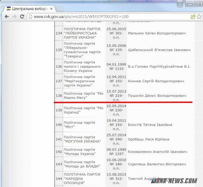 Центризбирком Украины не регистрировал партию "Ми Маємо Мету", руководителем которой значится Денис Пушилин, для участия в местных выборах, поскольку вообще не имеет права регистрировать партии. Об этом в Facebook написал заместитель председателя ЦИК Андрей Магера. На сайте ЦИК указано "Перечень политических партий, которым принято решение об участии их местных организаций в местных выборах", то есть перечень партий, зарегистрированных Министерством юстиции. "За 18 лет ЦИК никогда не регистрировал политических партий, общественных союзов любителей пива или свидетелей Иеговы" - написал Магера. Источник: dnr-news.com |
