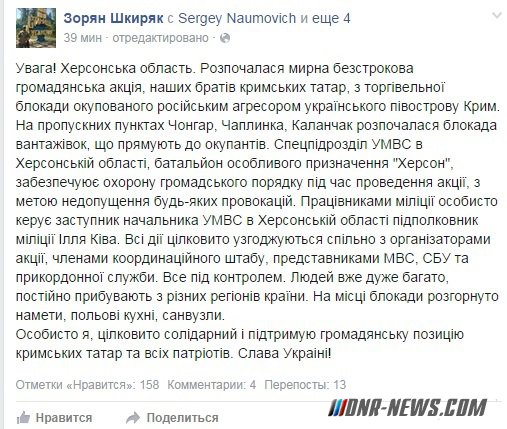 На границе Херсонской области Украины и Крыма в 12:00 восересенья, 20 сентября, стартовала бессрочная акция общественных активистов по торговому блокированию полуострова. Об этом сообщил советник главы МВД Украины Зорян Шкиряк на своей странице в Facebook в воскресенье, 20 сентября. "На пропускных пунктах Чонгар, Чаплинка, Каланчак началась блокада грузовиков, следующих на полуостров" – написал он. По его словам, спецподразделение Управления МВД в Херсонской области, батальон "Херсон" обеспечивает охрану общественного порядка во время проведения акции, с целью недопущения каких-либо провокаций. "Создан соответствующий координационный штаб акции. В него вошли и представители Правого сектора, в том числе командир ДУК ПС Андрей Стемпицкий и "Хорват", который осуществляет управление активистами ПС. Сейчас они непосредственно находятся на месте событий. Все действия полностью согласуются совместно с организаторами акции, членами координационного штаба, представителями МВД, СБУ и пограничной службы. Все под контролем" – написал Шкиряк. По словам советника главы МВД Украины, "людей уже очень много, постоянно прибывают из разных регионов страны". На месте блокады развернуты палатки, полевые кухни, санузлы. Специально под активистов будут рисовать "зебру", чтобы обеспечить безопасность. В акции также участвует народный депутат Рефат Чубаров.