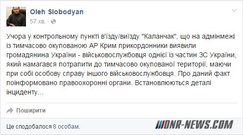 На контрольно-пропускном пункте Каланчак, на границе с Крымом, 22 сентября пограничниками был задержан военнослужащий одной из украинских военных частей. Об этом сообщил пресс-секретарь Госпогранслужбы Олег Слободян в Facebook. По его словам, военный пытался попасть на полуостров имея при себе личное дело другого военнослужащего. Информация передана правоохранительным органам.Выясняются детали инцидента, говорится в сообщении. Источник: dnr-news.com |