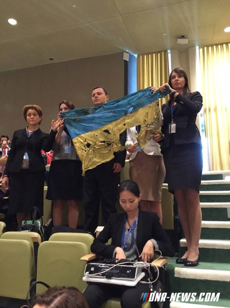 За нарушение регламента заседаний ООН часть украинской делегации попросили покинуть сессию Генассамблеи. Об этом в Facebook сообщила член украинской делегации Анна Гопко. "Из-за тихого протеста с простреленным флагом во время выступления Путина у нас забрали бейджики и попросили покинуть Генассамблею. Агрессия России - это тоже нарушение правил ООН. Но Путин выступает с трибуны" - написала Гопко. В пресс-службе МИД сообщили, что флаг развернула часть украинской делегации, которая покинула зал с началом выступления российского президента. Источник: dnr-news.com |