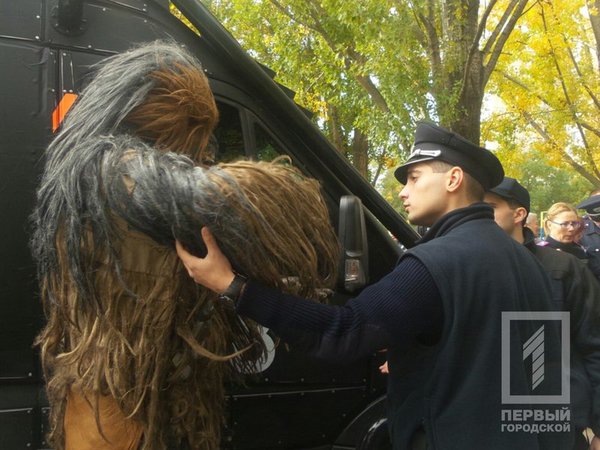![]() Чубакка был за рулем одной из машин в команде кандидата в депутаты горсовета Дарта Вейдера. Правоохранители попросили неизвестного представиться, однако он отказался предъявлять документы и добровольно ехать в отделение. Полицейским пришлось скрутить Чубакку. Отмечается, что сотрудникам правоохранительных органов было тяжело стянуть перчатки от костюма, чтобы надеть наручники на нарушителя. В свою очередь Дарт Вейдер после задержания члена своей команды объяснил, что Чубакка — домашнее животное, у которого нет прописки, а живет он в катакомбах.