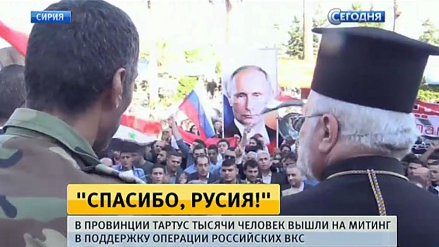 Как передает корреспондент НТВ Алексей Ивлиев, все окраины Тартуса опустели. Все население города пришло в центр для того, чтобы принять участие в митинге в поддержку действий российской авиации в Сирии. Очень необычный митинг: никаких официальных речей. Люди подходили к журналистам, обнимали их и на ломаном русском постоянно звучало «Спасибо, Русия!». Здесь огромное количество тех, кто учился когда-то в Советском Союзе, у кого русские жены. Но поприветствовать помощь из России пришли не только они, весь город. В том числе представители различных религиозных конфессий.